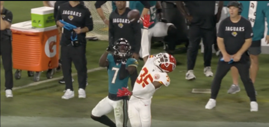 4.- Jaylen Watson fue quemado en el último drive: Con un minuto por jugar, Lawrence se encontraba en situación de 3&7 en su propia yarda 42 y, frente a la presión de Nick Bolton, logra sacar un pase desesperado de 30 yardas hacia Brian Thomas. La cobertura de Watson es correcta y tiene una muy buena oportunidad de desviar el pase, pero falla notablemente y como resultado los Jaguars logran sobrevivir ganando poco más de 30 yardas en el intento.